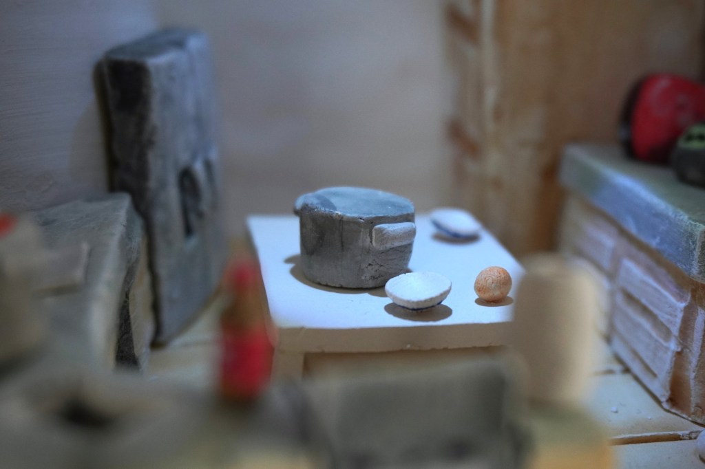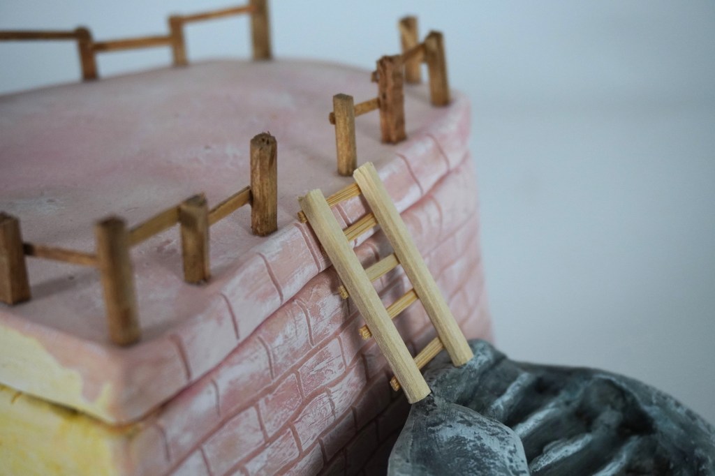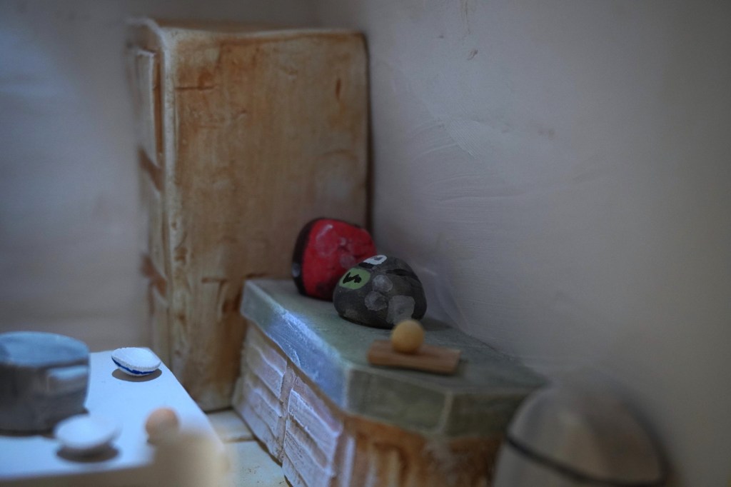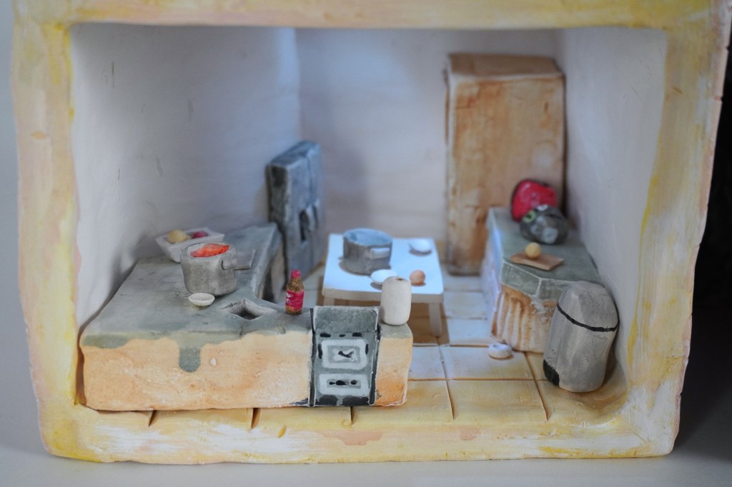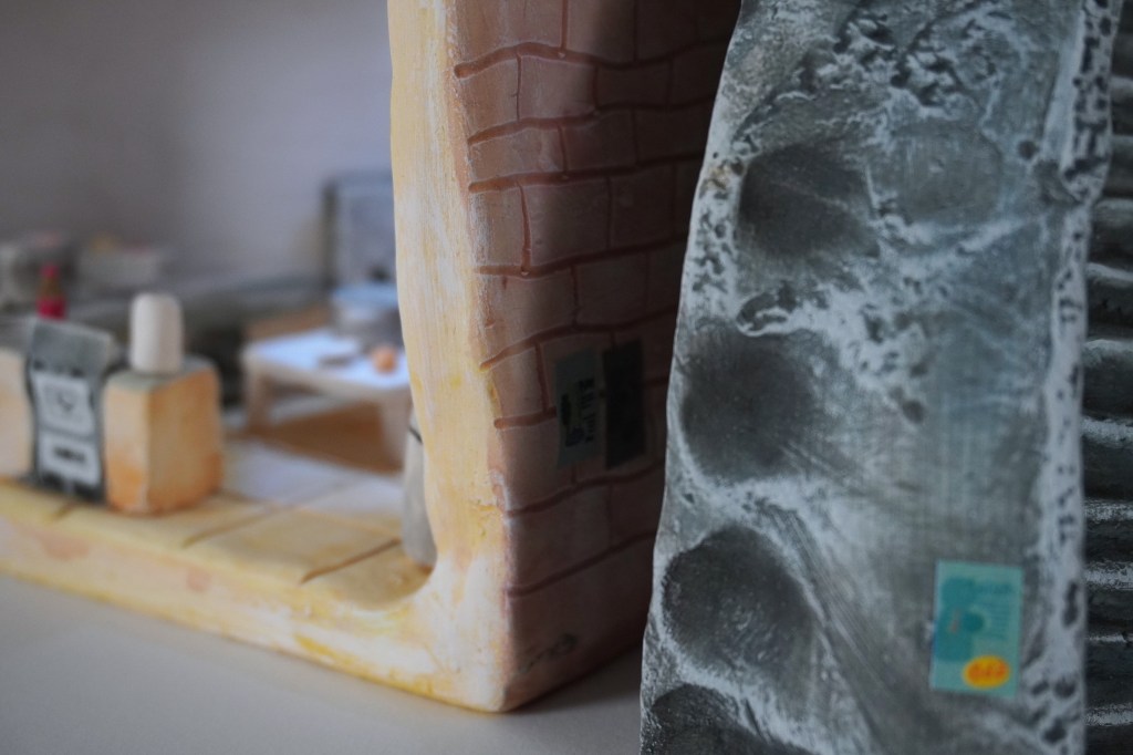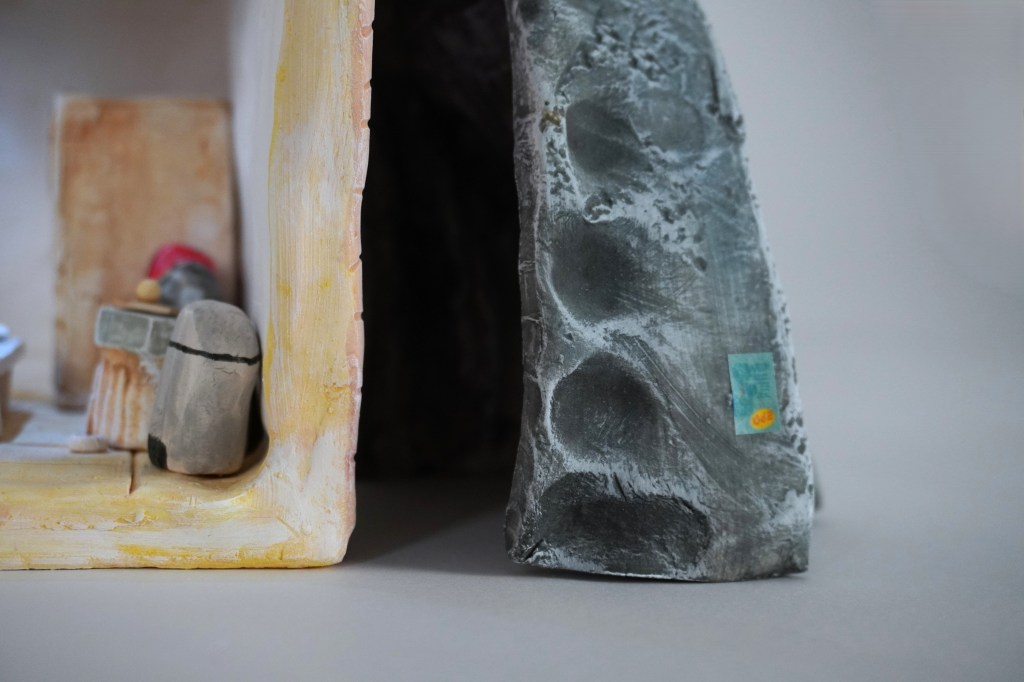 White stoneware, underglaze, acrylic paint, disposable chopsticks, coffee stirrers, parchment paper, LED lights