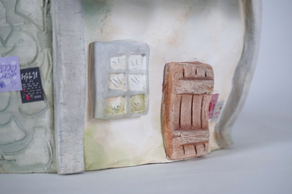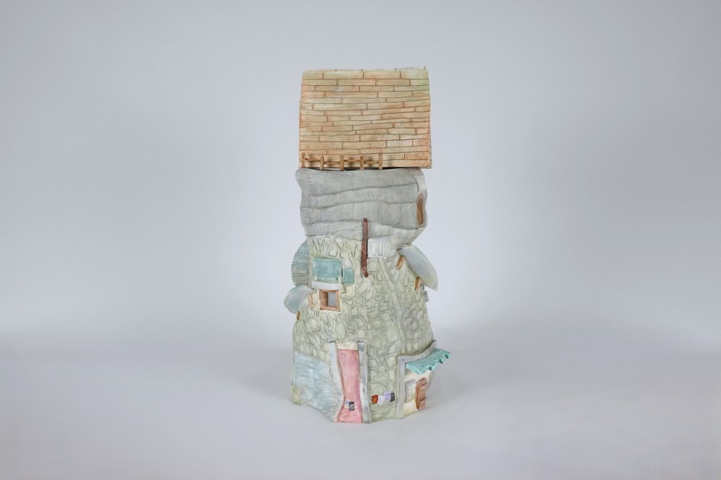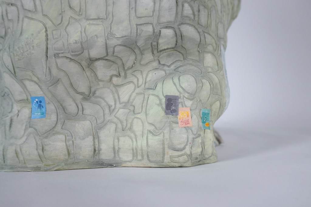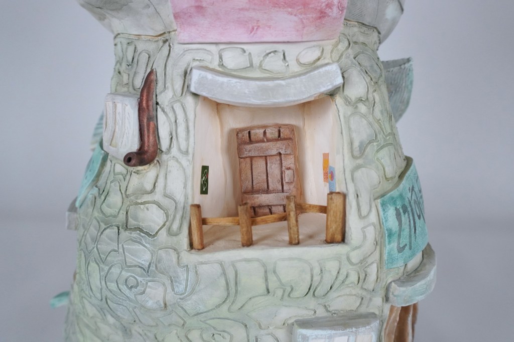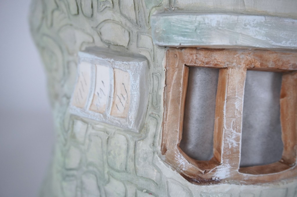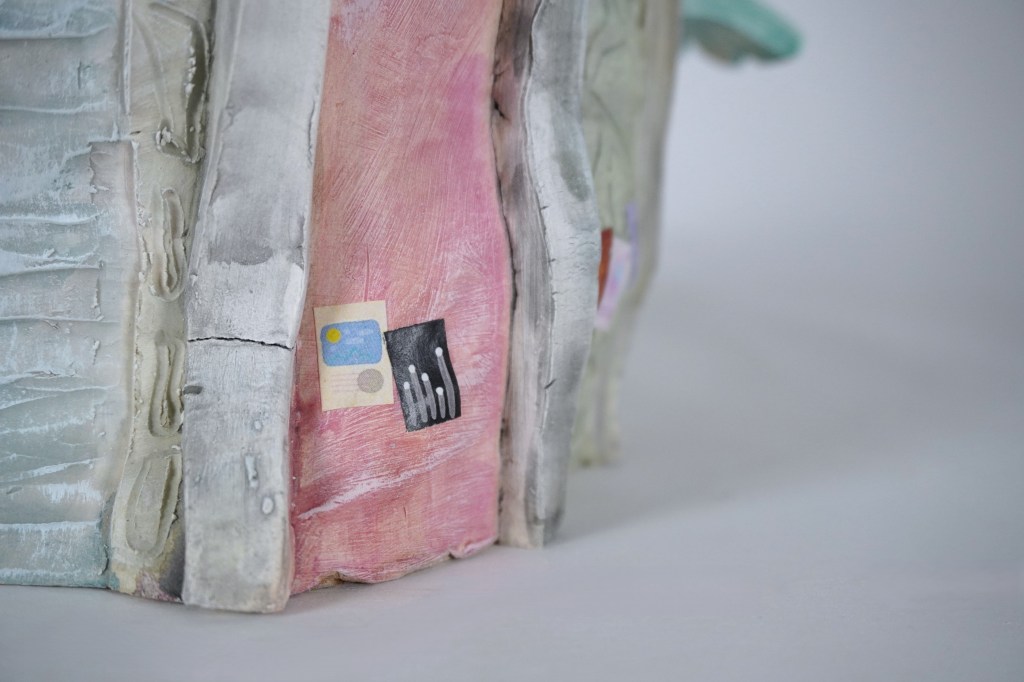 White stoneware, underglaze, acrylic paint, disposable chopsticks, coffee stirrers, parchment paper, LED lights