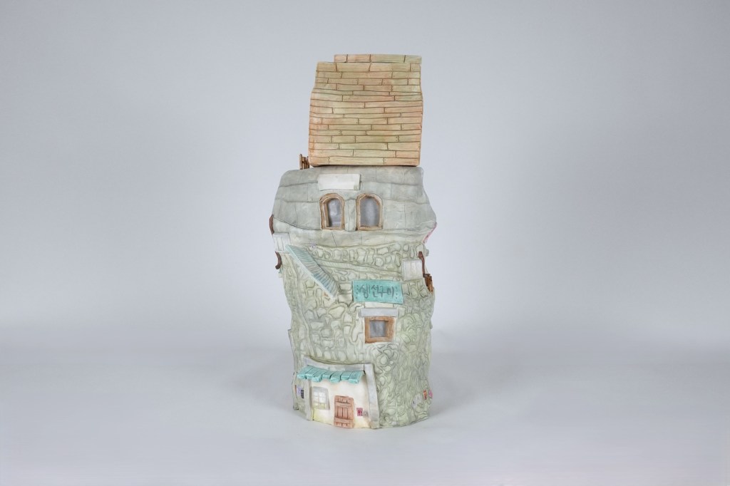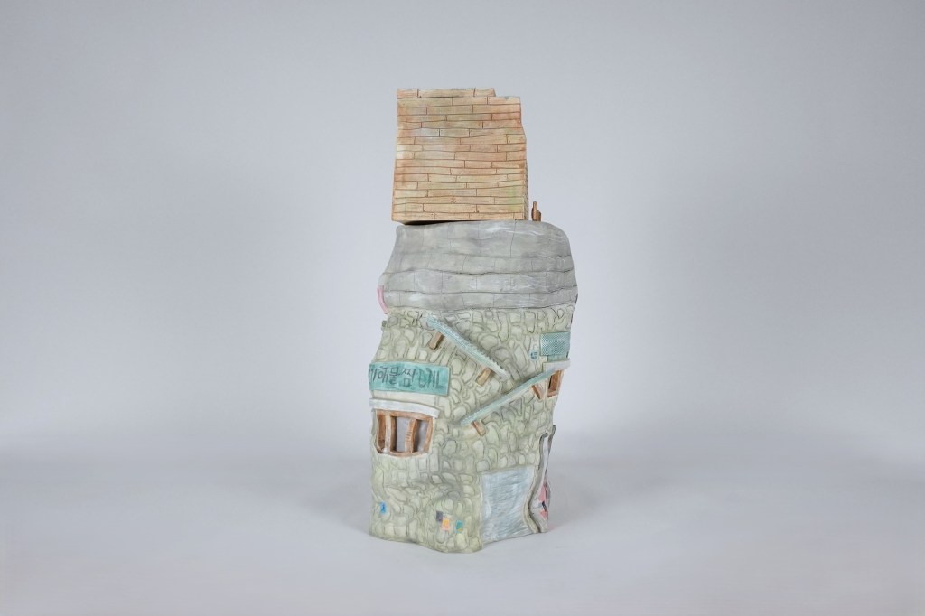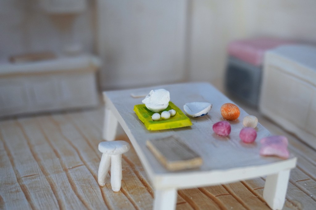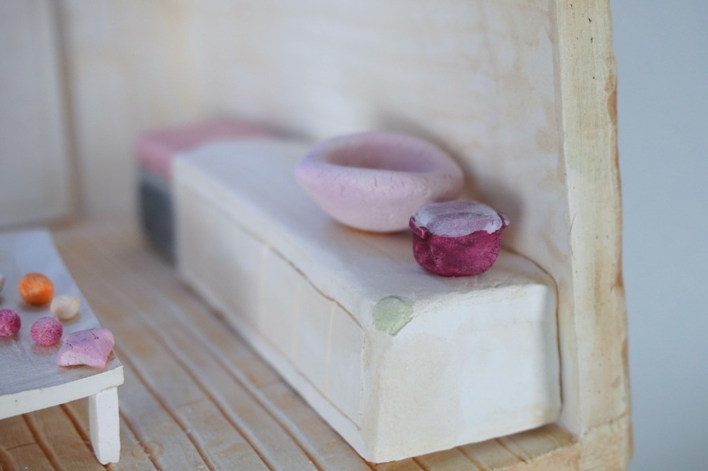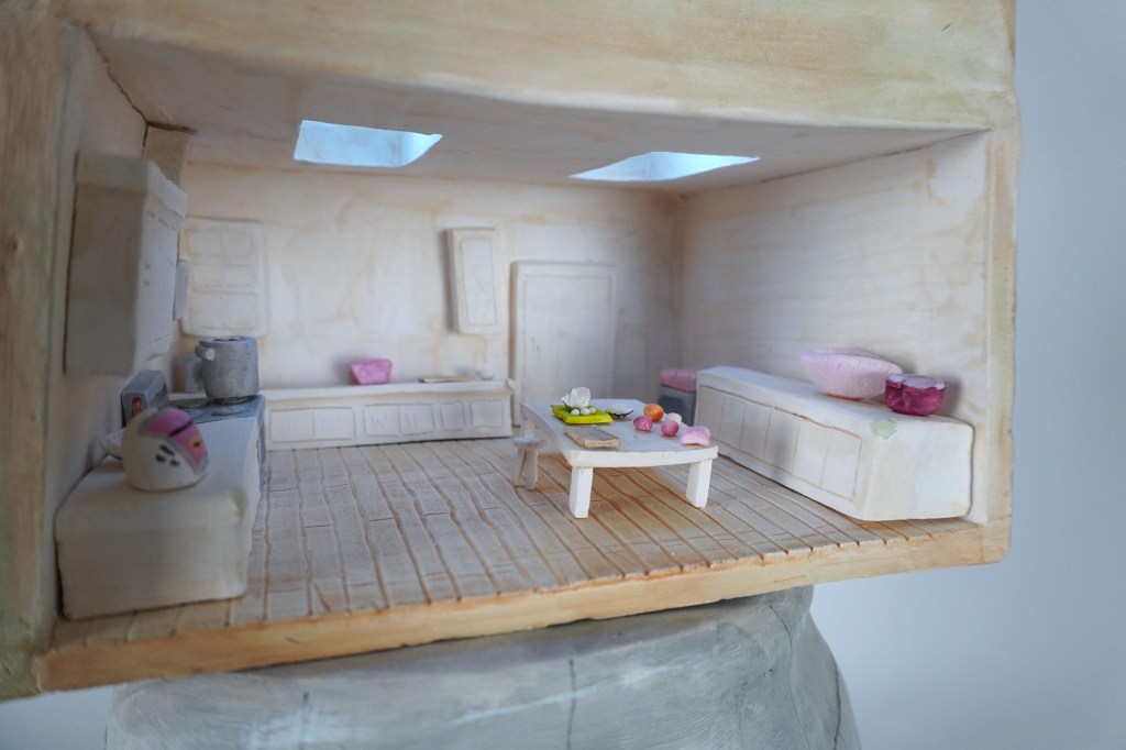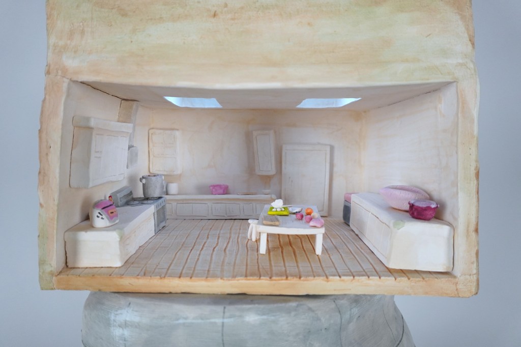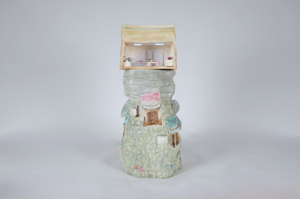 White stoneware, underglaze, acrylic paint, disposable chopsticks, coffee stirrers, parchment paper, LED lights