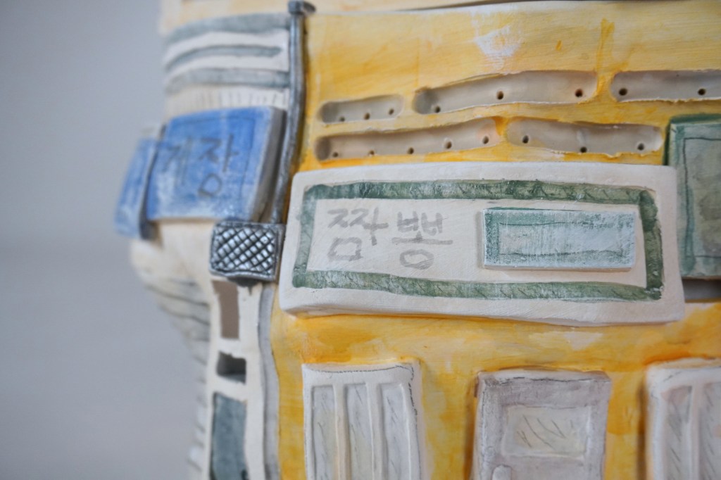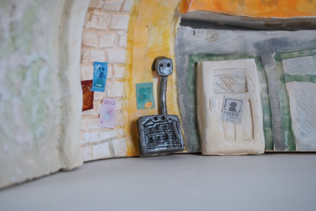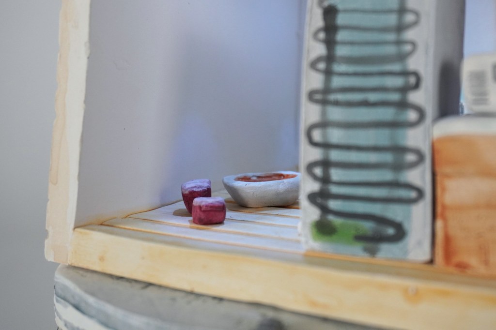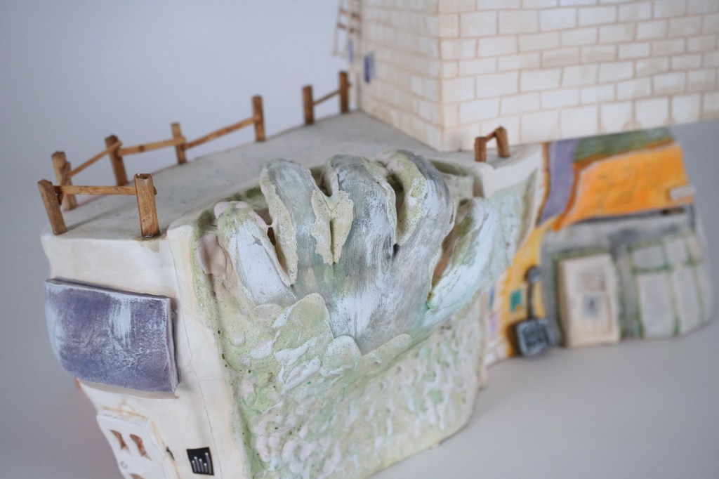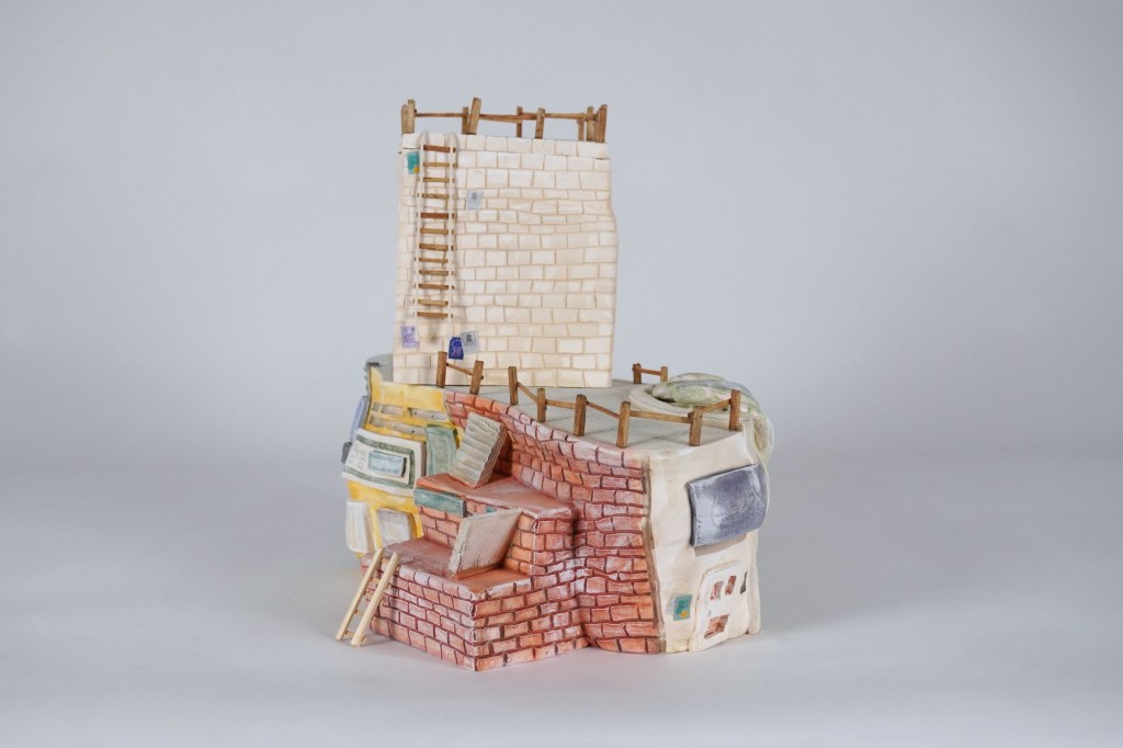 White stoneware, underglaze, Egyptian paste, acrylic paint, disposable chopsticks, coffee stirrers, kitchen twine, parchment paper, LED lights