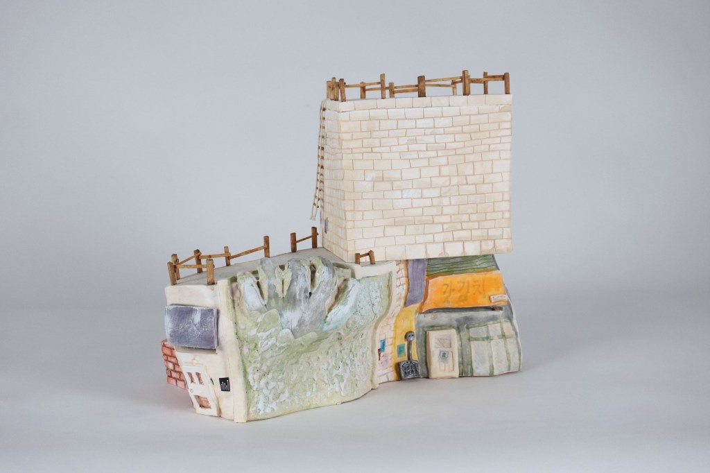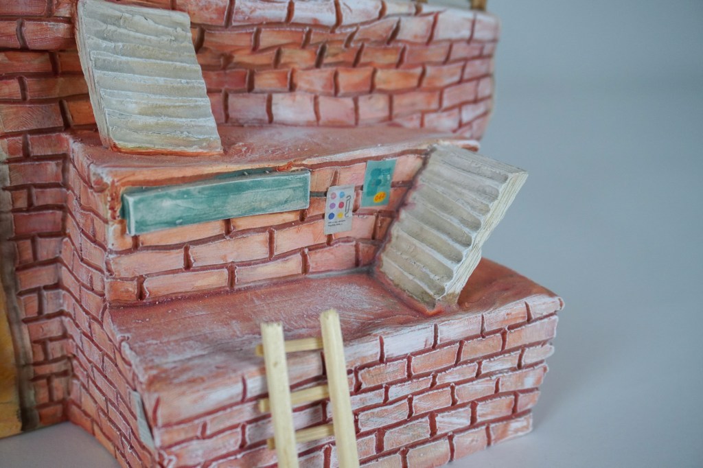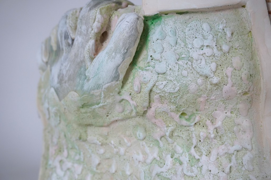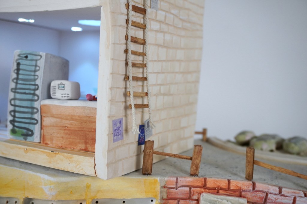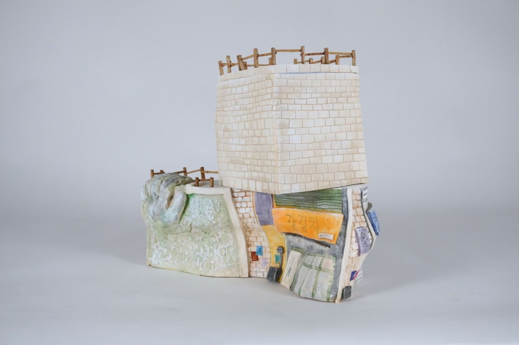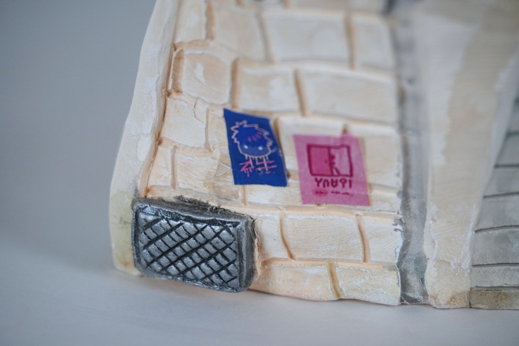 White stoneware, underglaze, Egyptian paste, acrylic paint, disposable chopsticks, coffee stirrers, kitchen twine, parchment paper, LED lights