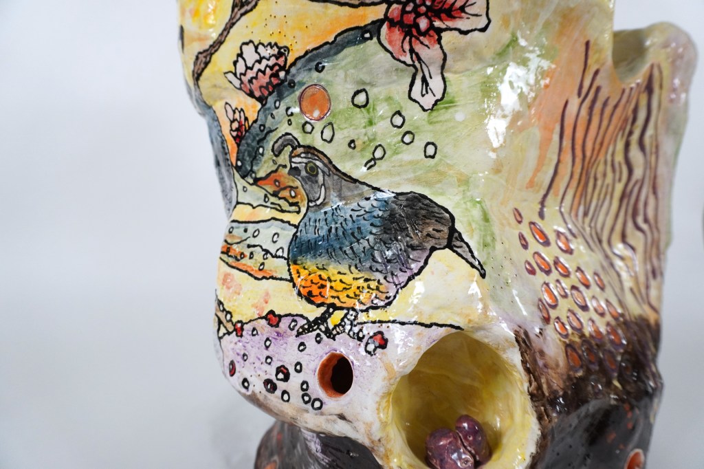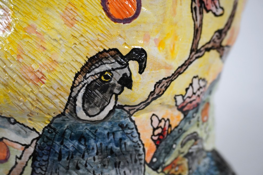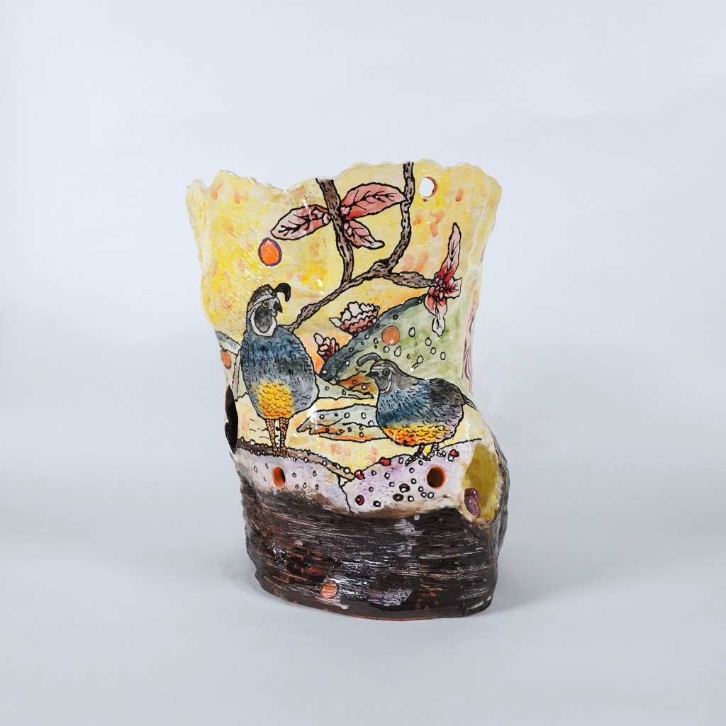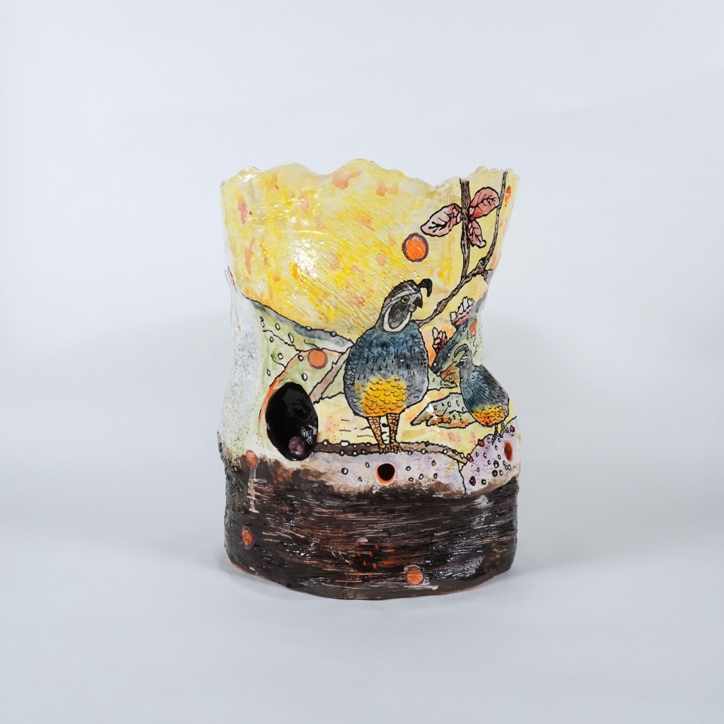 I did not know that the consequence of moving to America was me abandoning many aspects of my Korean background. After many years of living as a Californian, my memories in Korea feel ancient. I’ve captured my journey with immigration with the painting of California quails, the state bird, in the style of minhwa, a traditional Korean folk art typically created by commoners to depict their ordinary lives. I painted a symbol from my present in one of the styles found in my past.