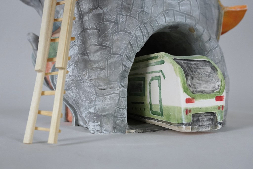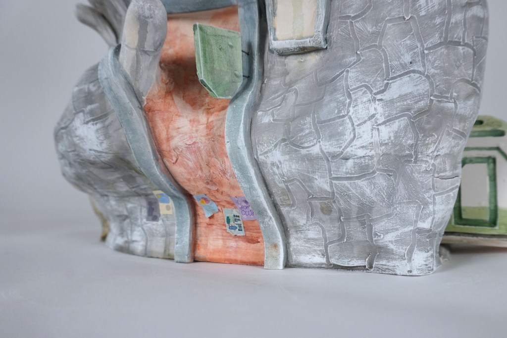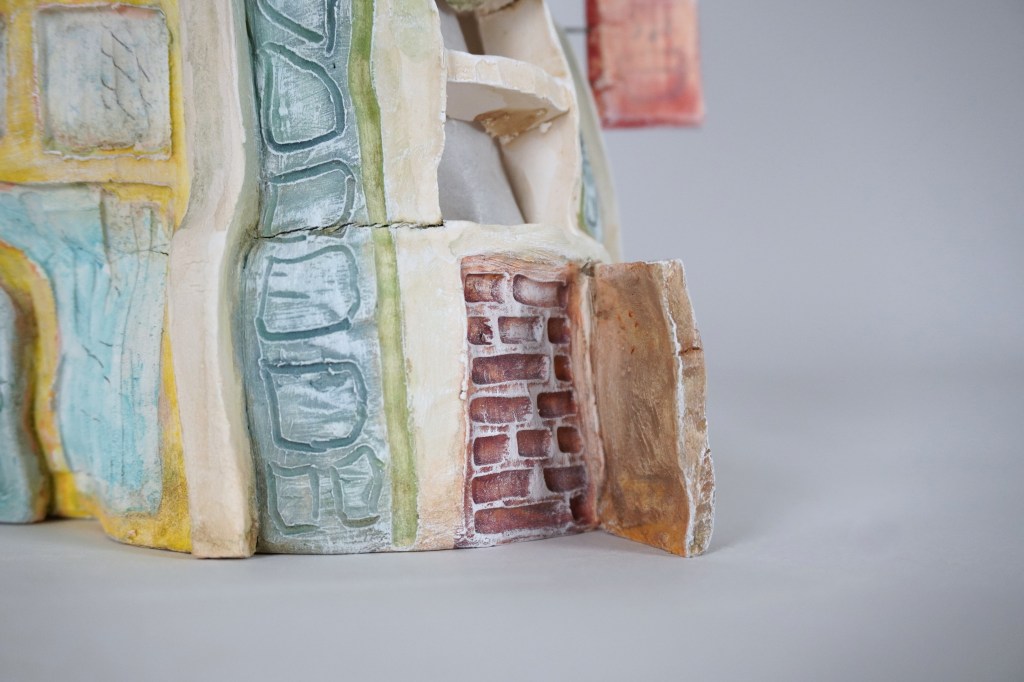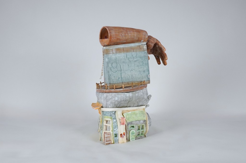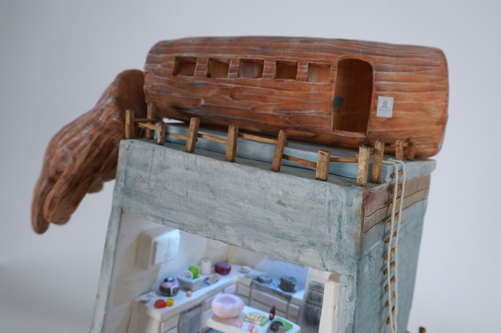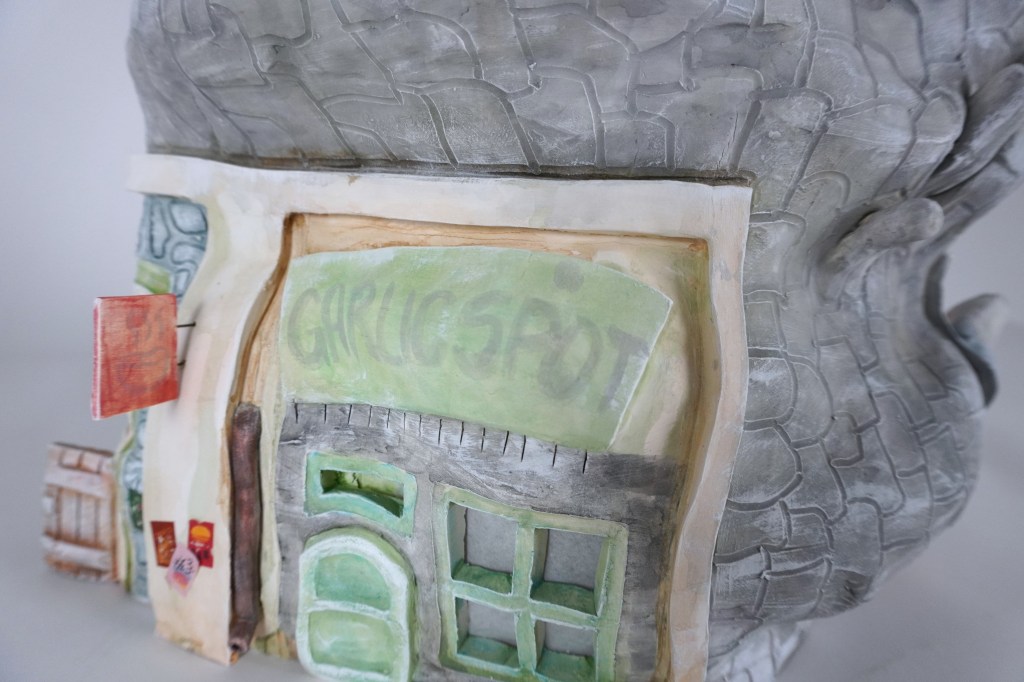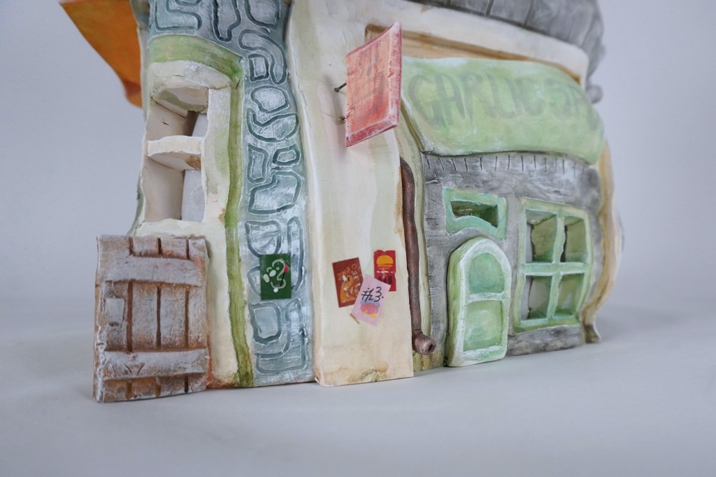 White stoneware, underglaze, acrylic paint, disposable chopsticks, coffee stirrers, kitchen twine, parchment paper, LED lights
