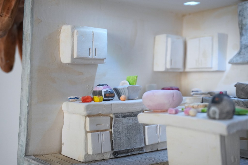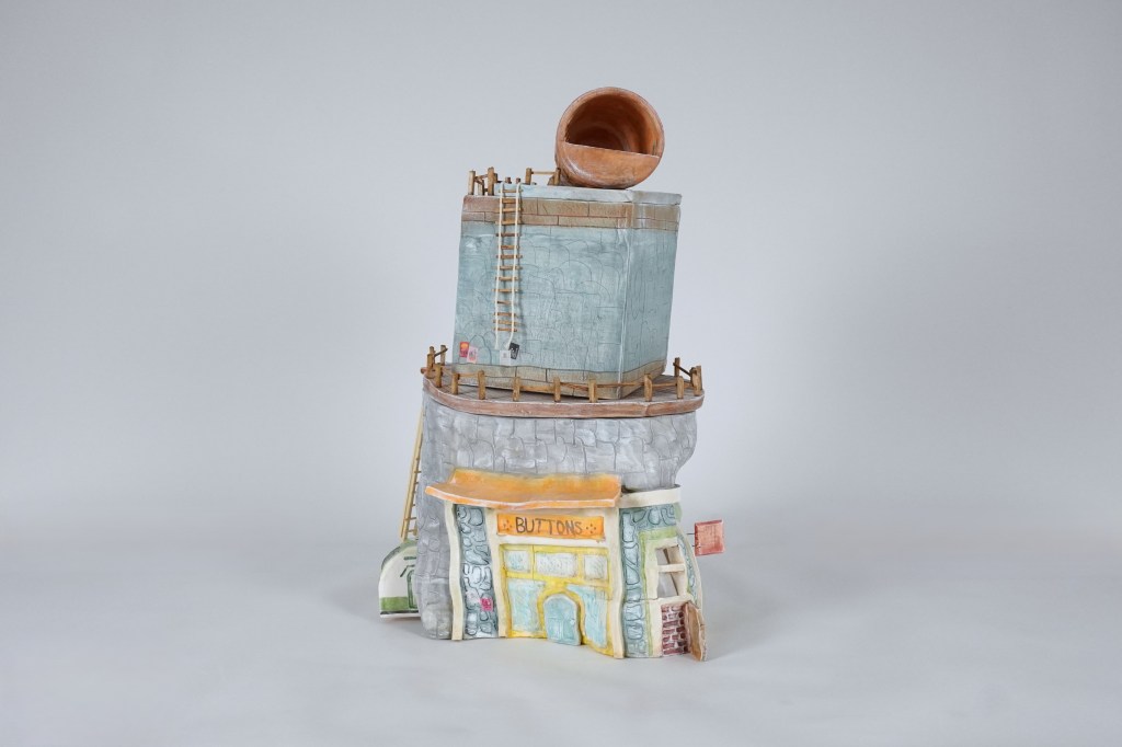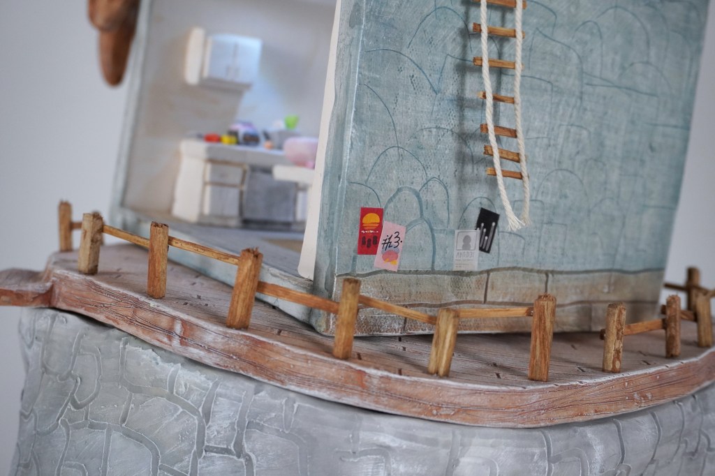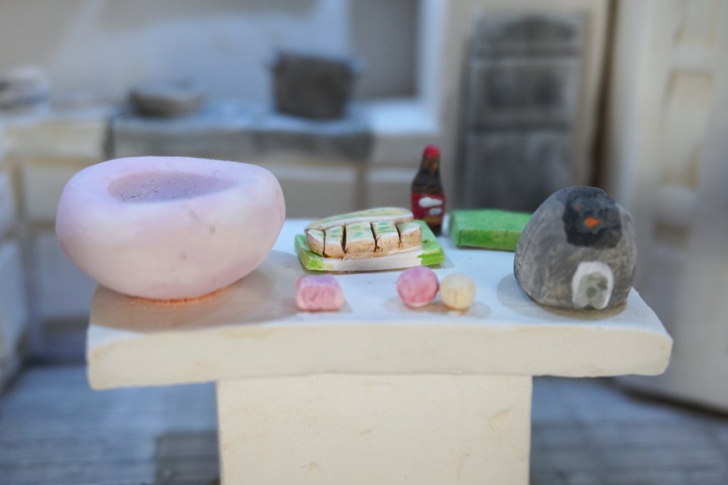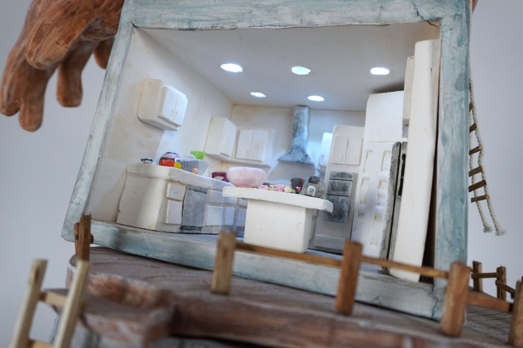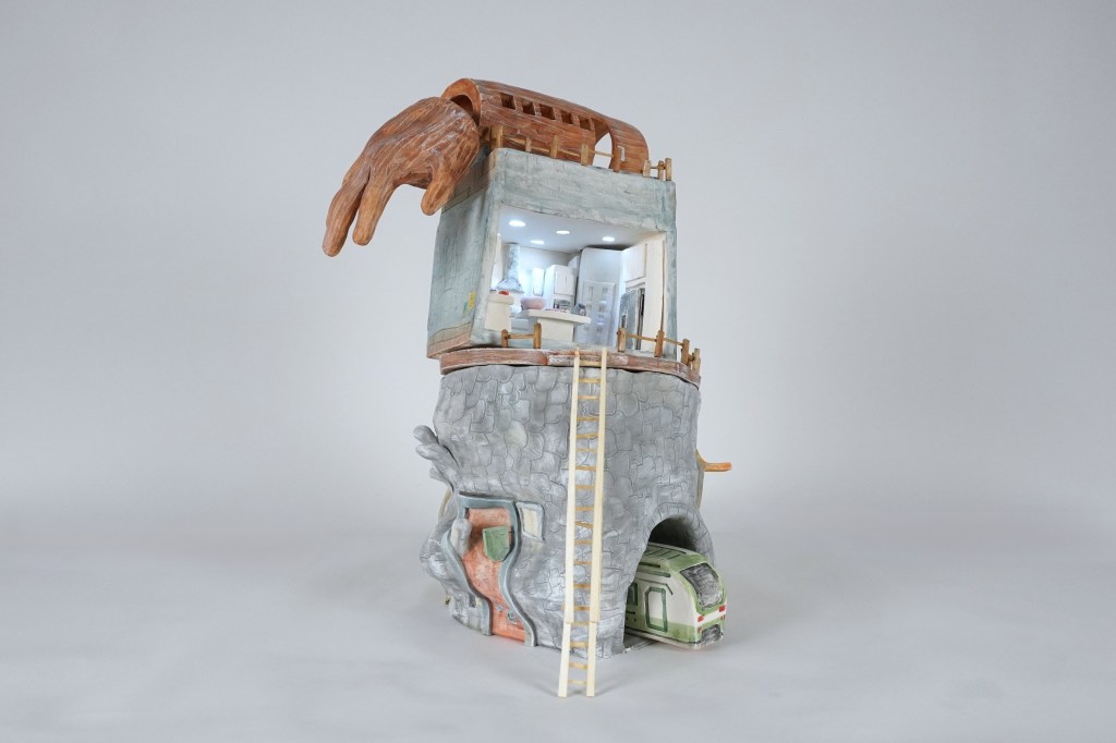 White stoneware, underglaze, acrylic paint, disposable chopsticks, coffee stirrers, kitchen twine, parchment paper, LED lights