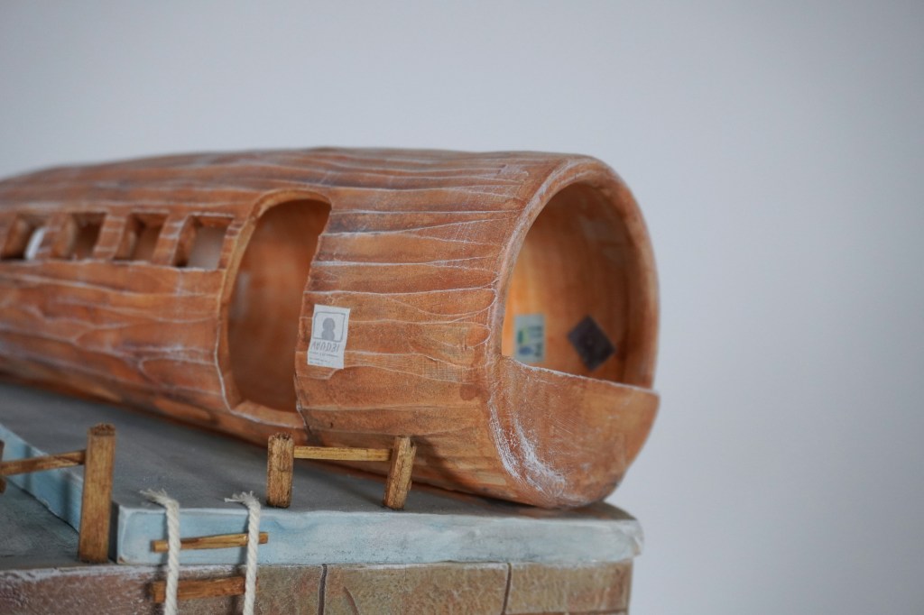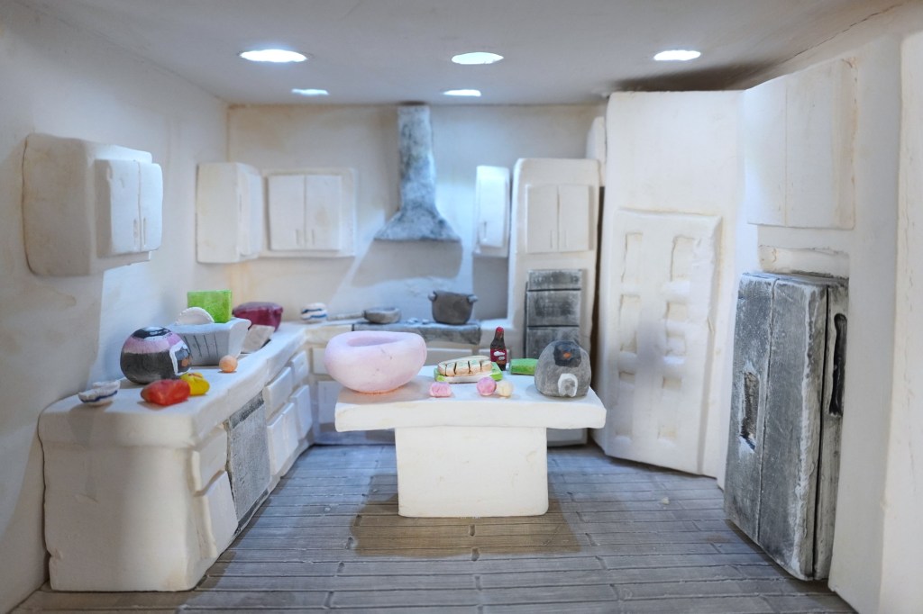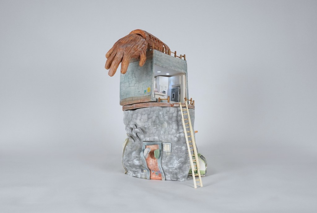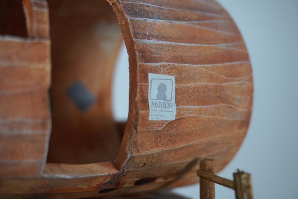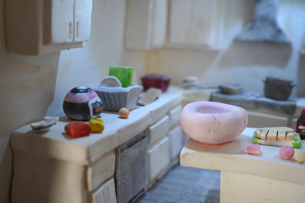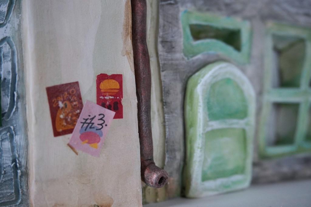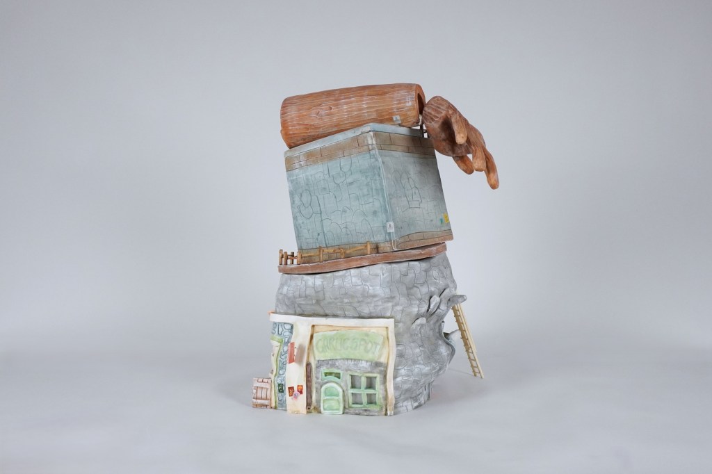 White stoneware, underglaze, acrylic paint, disposable chopsticks, coffee stirrers, kitchen twine, parchment paper, LED lights