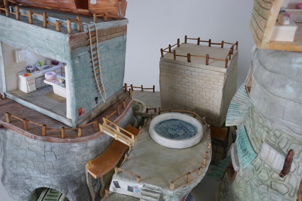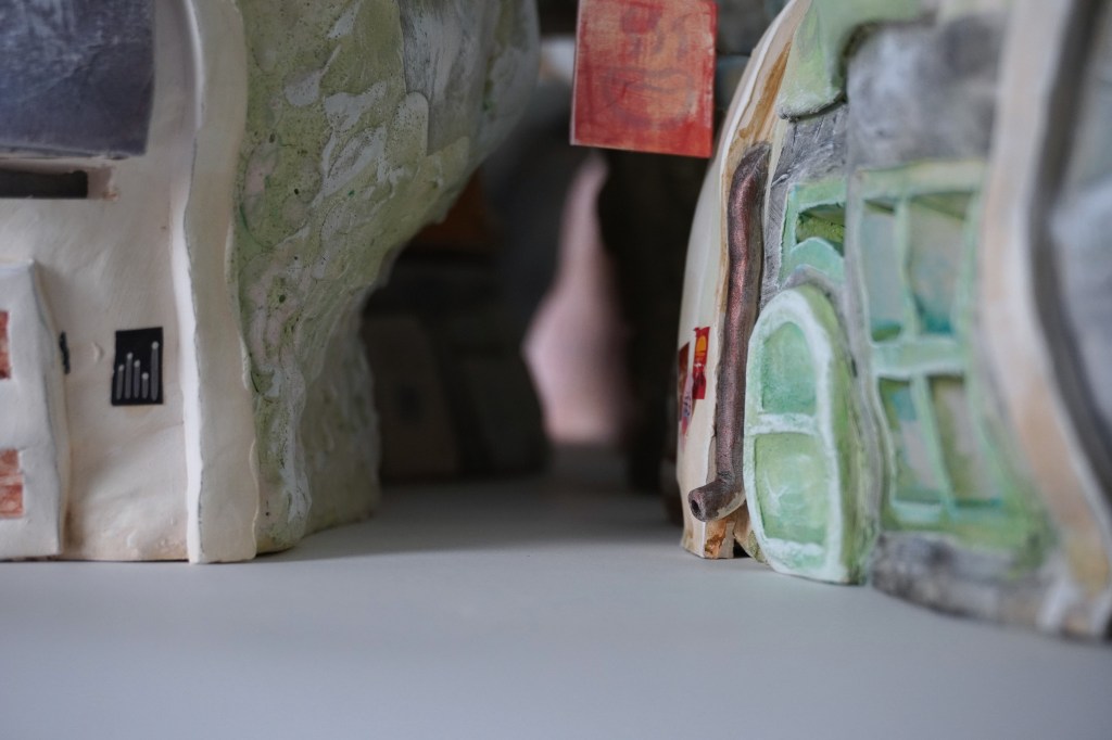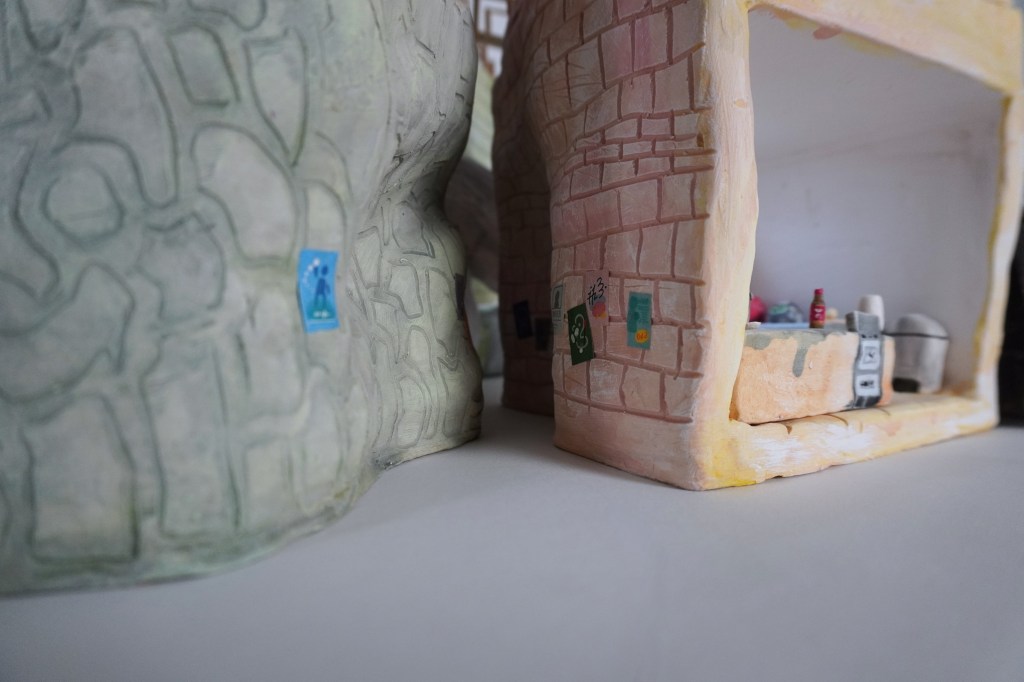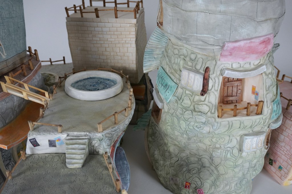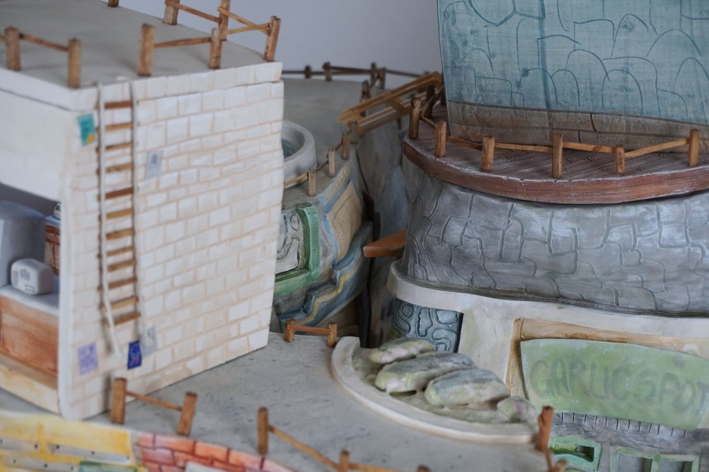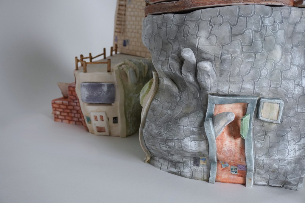 White stoneware, underglaze, glaze, Egyptian paste, acrylic paint, disposable chopsticks, coffee stirrers, kitchen twine, parchment paper, LED lights