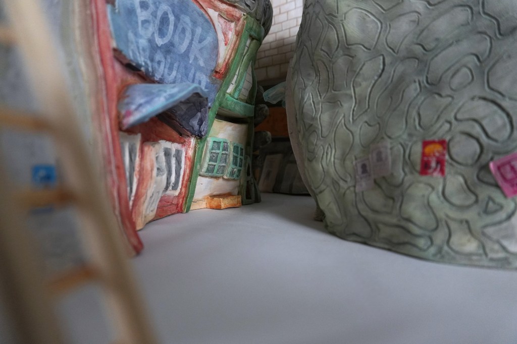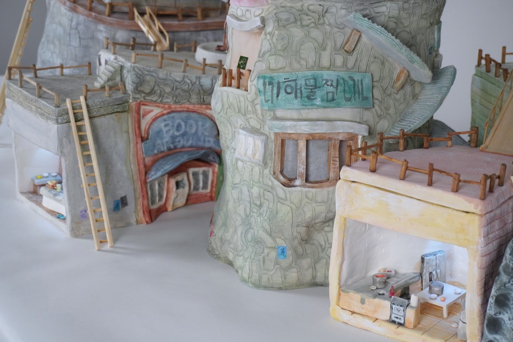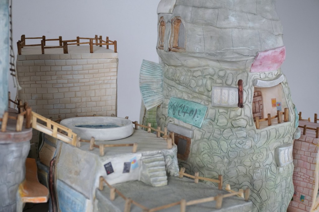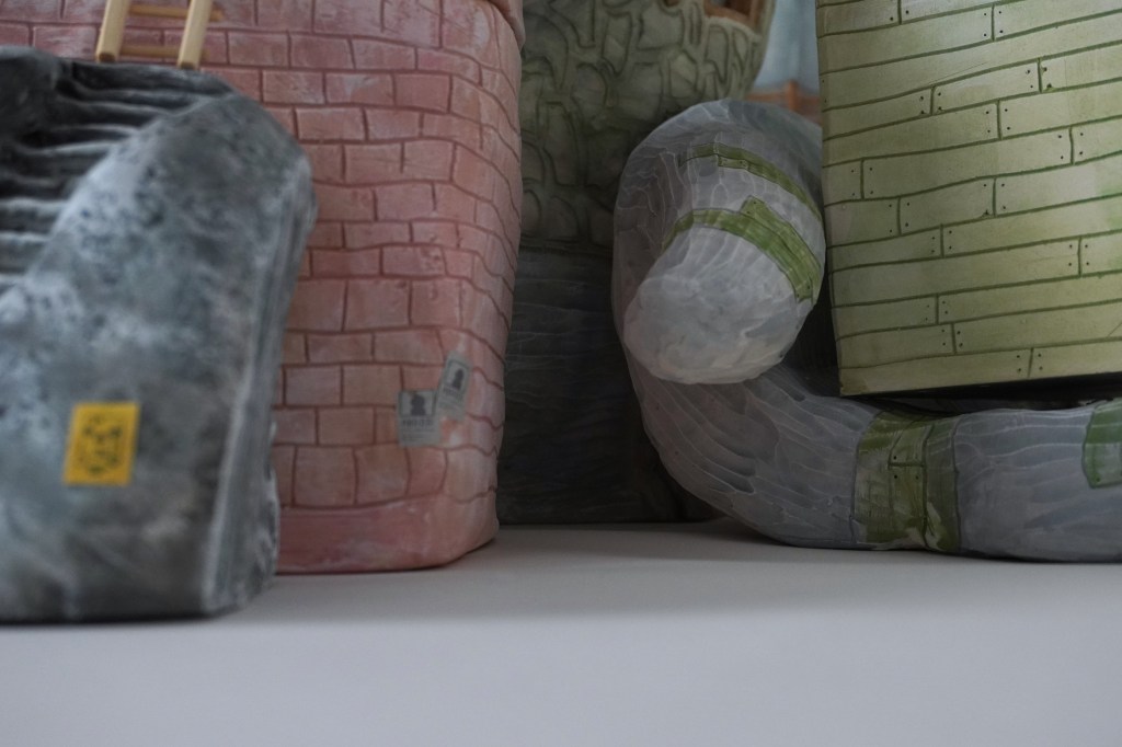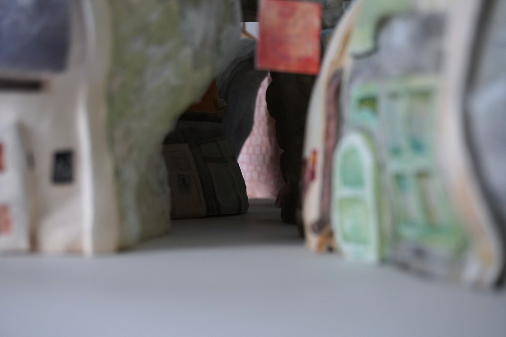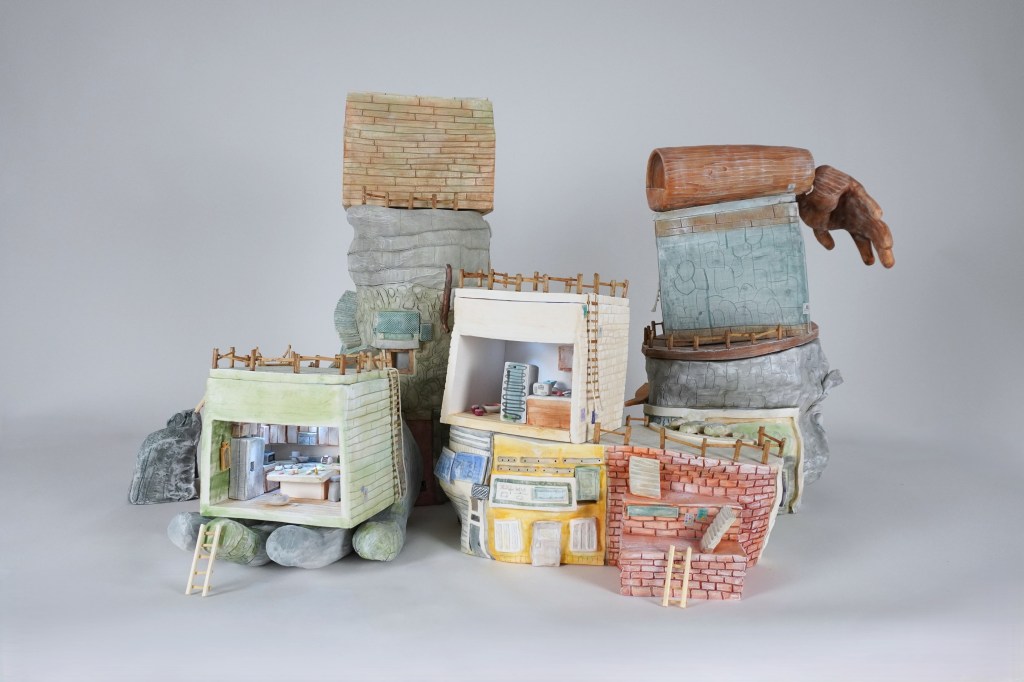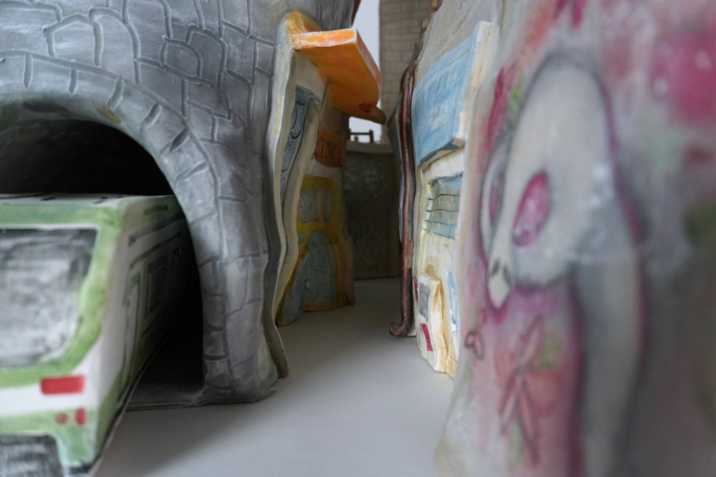 White stoneware, underglaze, glaze, Egyptian paste, acrylic paint, disposable chopsticks, coffee stirrers, kitchen twine, parchment paper, LED lights