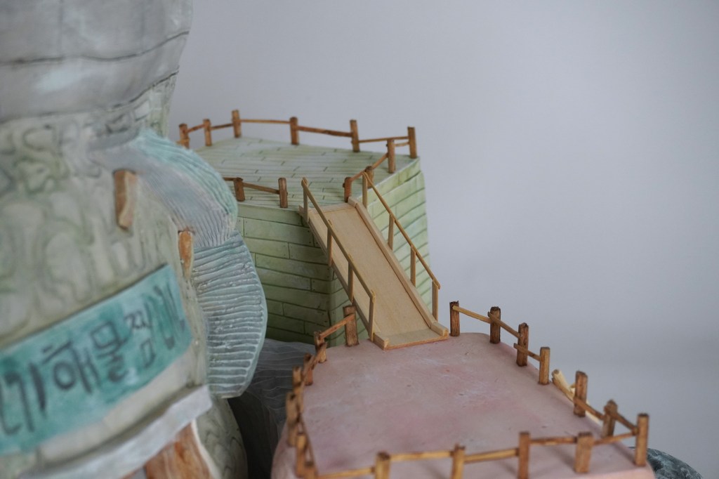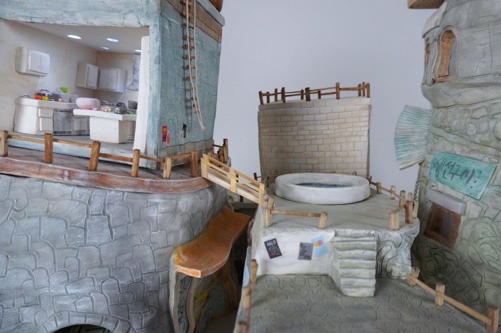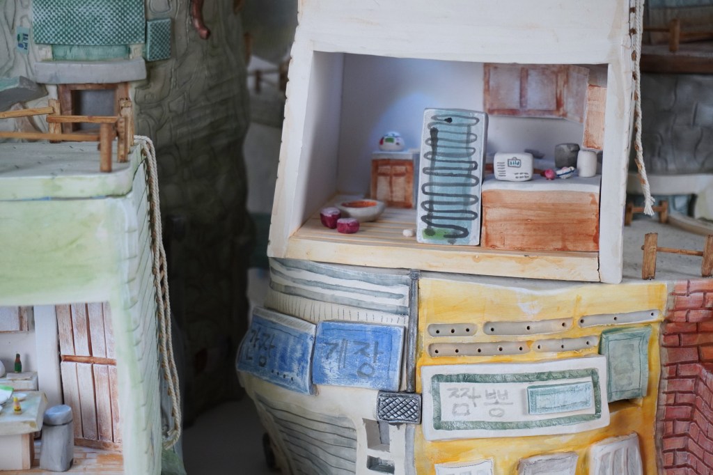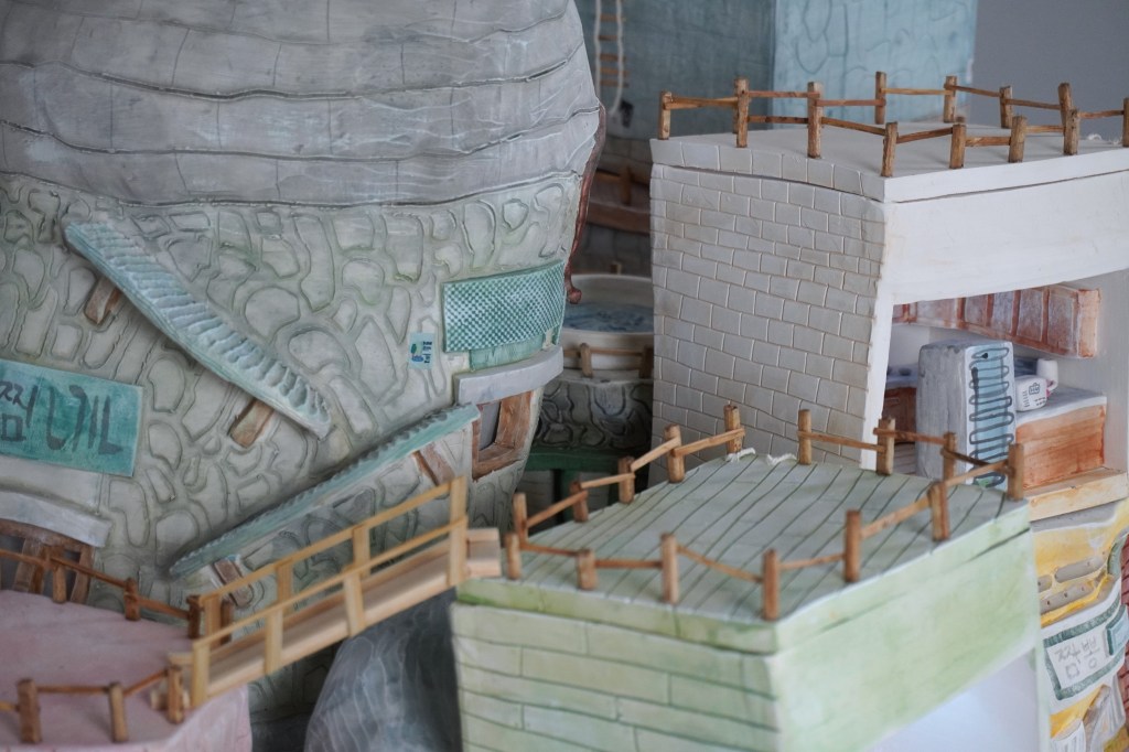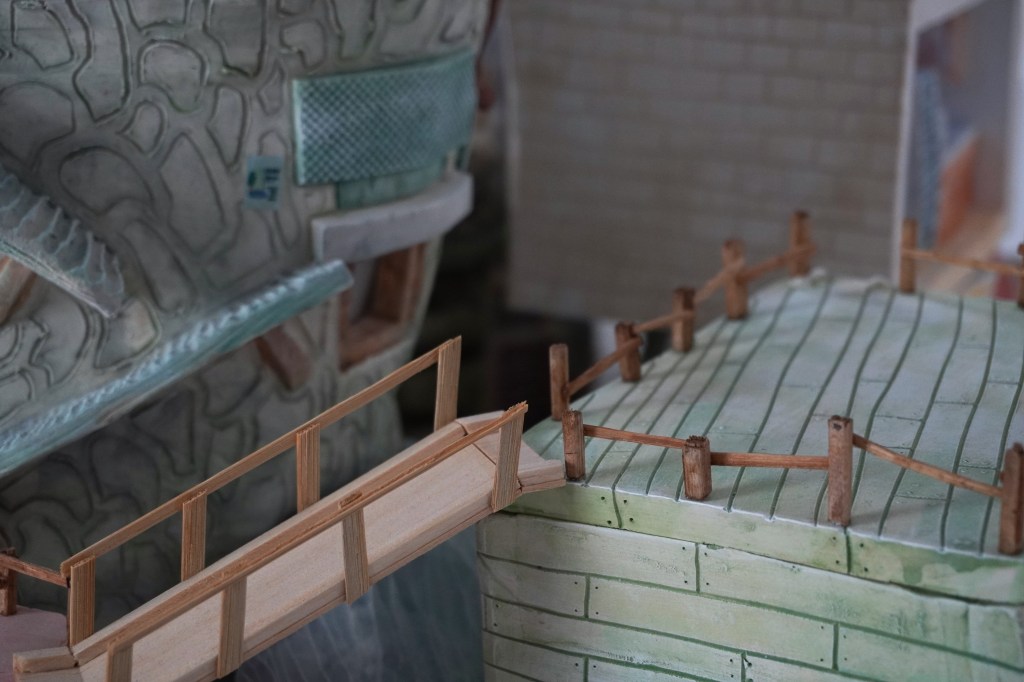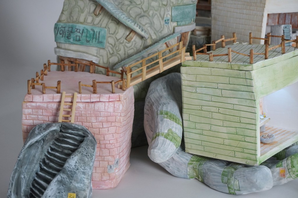 White stoneware, underglaze, glaze, Egyptian paste, acrylic paint, disposable chopsticks, coffee stirrers, kitchen twine, parchment paper, LED lights